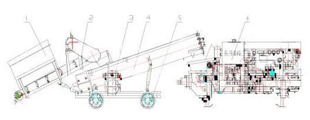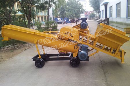本攪拌機為便于運輸及存放,采用分體式結(jié)構(gòu)。水泥輸送帶、沙子輸送帶、細(xì)石輸送帶為一部件,螺旋攪拌為一部件。為便于活動以上各部件都裝有拖輪或滾輪。運輸時攪拌機構(gòu)放下支腿使導(dǎo)軌輪離地即可裝車運輸。