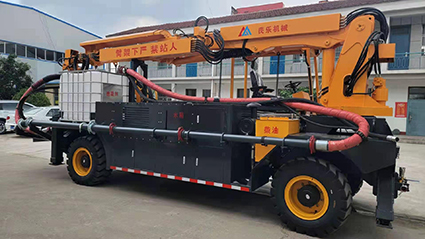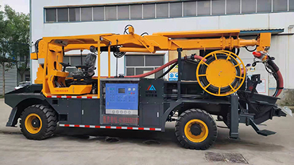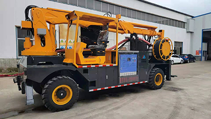 混凝土濕噴臺車包括液壓噴射機(jī)械手、噴射機(jī)(泵)、外加劑及其添加設(shè)備和電纜卷盤、空壓機(jī)等,都安裝在同一機(jī)械底盤上,是一臺集混凝土泵送、外加劑添加、混凝土噴射等多項作業(yè)于一體的組合設(shè)備?;炷翝駠娕_車的各組成系統(tǒng)在整體設(shè)計上統(tǒng)一考慮了其布局的合理性,做到了易于維修,并具有易于清洗的特點(diǎn)。